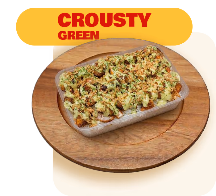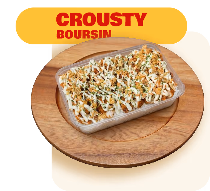 Riz blanc, filet de poulet pané maison, sauce boursin et oignons frits.